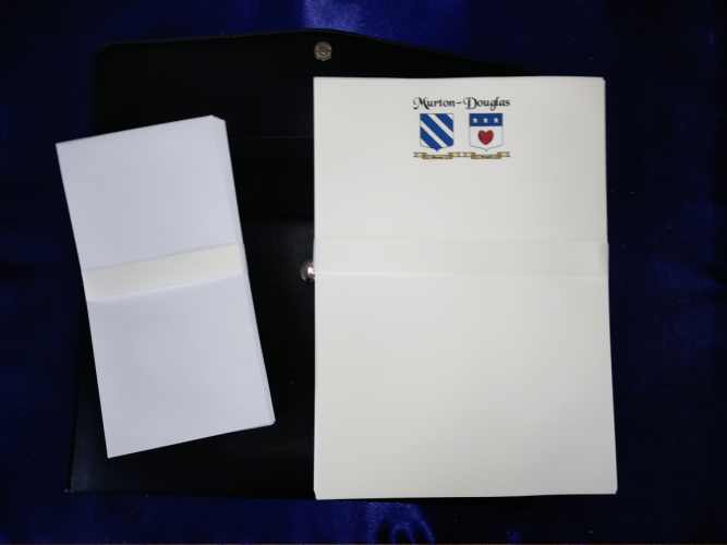 50 sheets of Vellum quality paper that display the family crest for YOUR name. We can insert your name, address and contact details free of charge on your family crest stationery that makes an unusual but thoughtful gift. 20 quality envelopes are added and the stationery is housed in a smart black durable folder.